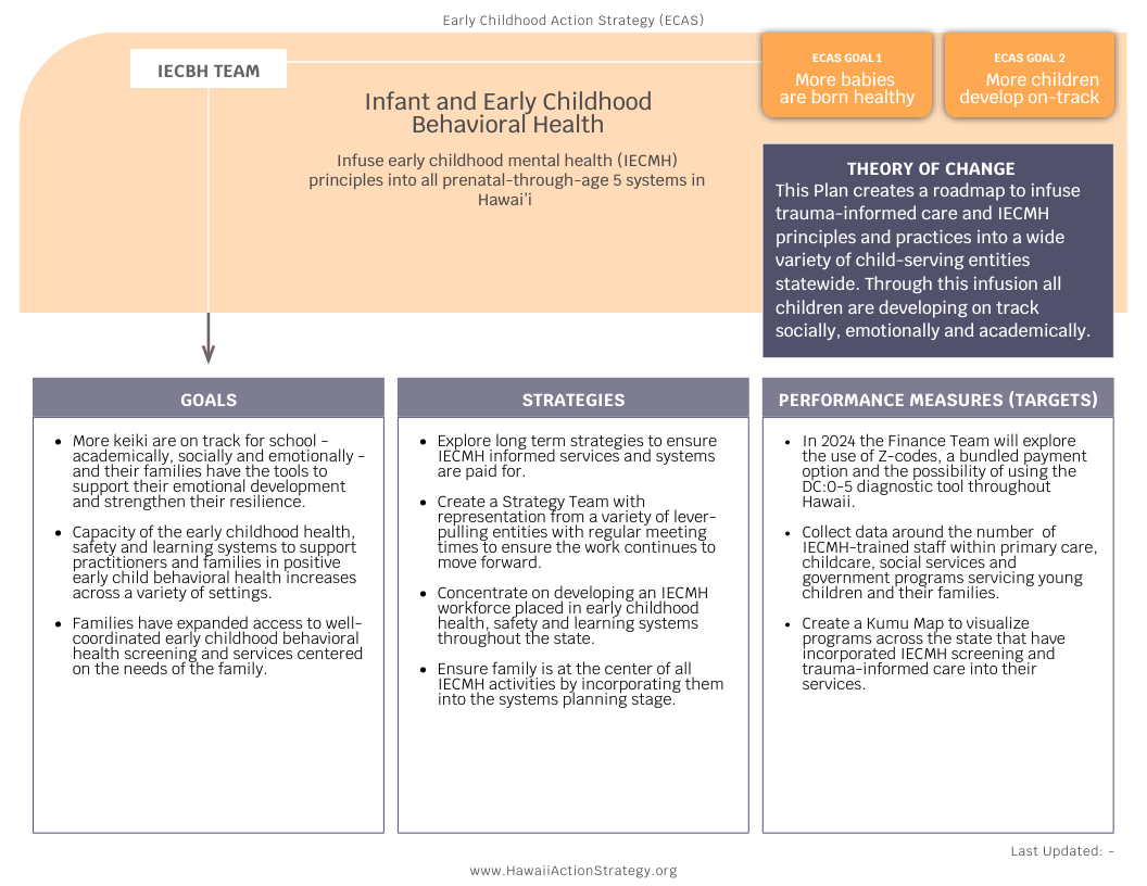 Christina Simmons 8/13/24 Christina Simmons 8/13/24 2024 IECBH Team Tracking Read More Christina Simmons 8/13/24 Christina Simmons 8/13/24 Draft: Purpose of the Strategy Team Read More Christina Simmons 8/13/24 Christina Simmons 8/13/24 Draft: IECBH Theory of Change Read More Christina Simmons 8/13/24 Christina Simmons 8/13/24 DRAFT IECBH Plan Logic Model Read More Christina Simmons 6/10/24 Christina Simmons 6/10/24 Draft Logic Model for DC 0-5 Implementation Read More Christina Simmons 4/8/24 Christina Simmons 4/8/24 Family and Infant/Child MH Sheet - Hawaii DRAFT Read More Christina Simmons 4/1/24 Christina Simmons 4/1/24 Five Years of Promising Minds - Strengthening Systems for Infant & Early Childhood Mental Health Evaluation Report Read More Christina Simmons 11/1/23 Christina Simmons 11/1/23 IECBH Plan Update: 07.2022-11.2023 Read More Christina Simmons 1/1/23 Christina Simmons 1/1/23 IECBH Tracking Sheet Read More Christina Simmons 1/1/23 Christina Simmons 1/1/23 2022 IECBH Plan Cover Letter Read More Christina Simmons 7/1/22 Christina Simmons 7/1/22 IECBH Plan Version 2 Read More